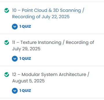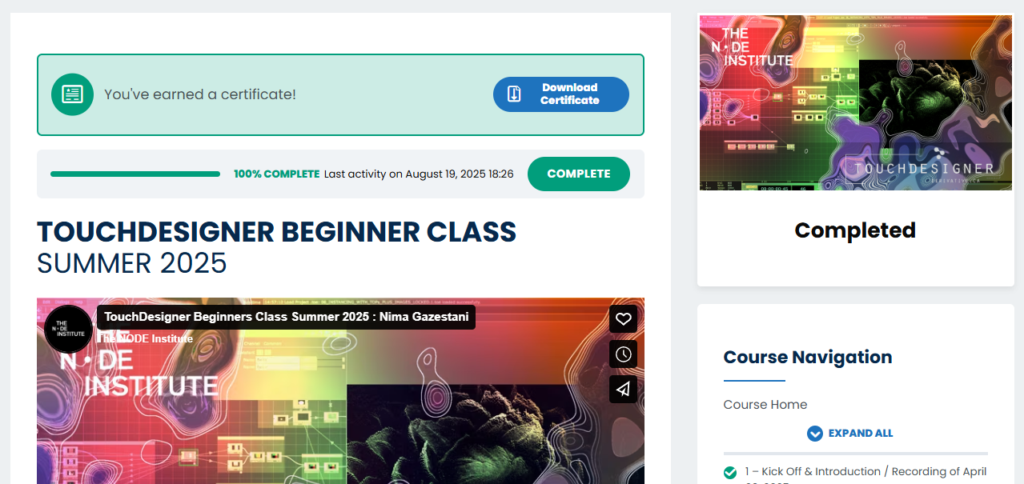 You will be able to download a Certificate of Participation once you have marked all lessons and quizzes as completed. The certificate will automatically appear on the course page when your course completion reaches 100%. Lessons either include quizzes that must be completed or a green ‘Complete’ button at the bottom of the page. The image below shows the green dot indicating that a lesson or quiz has been completed.